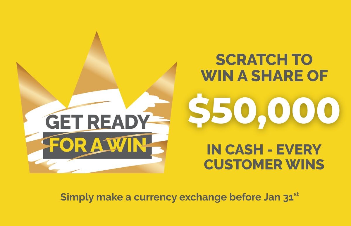 Visit Crown Currency Exchange and Scratch to WIN your share of $50,000 in cash. You are guaranteed to win something just by transacting with us. How to Play 1. Make any transaction at Crown Currency Exchange. 2. Opt-in to our Royal Customer List. 3. Play our digital Scratch & Win game. What You Could Win: Major Prizes (1,000 Winners): A free $50 cash voucher for any currency of your choice! Guaranteed Win: Receive our Platinum Exchange Rate Voucher for a discount on your next transaction! Don't miss this limited-time promotion, exchange with us between Dec 1st, 2025 - Jan 31st, 2026. Come to Crown Currency Exchange today, every customer wins!