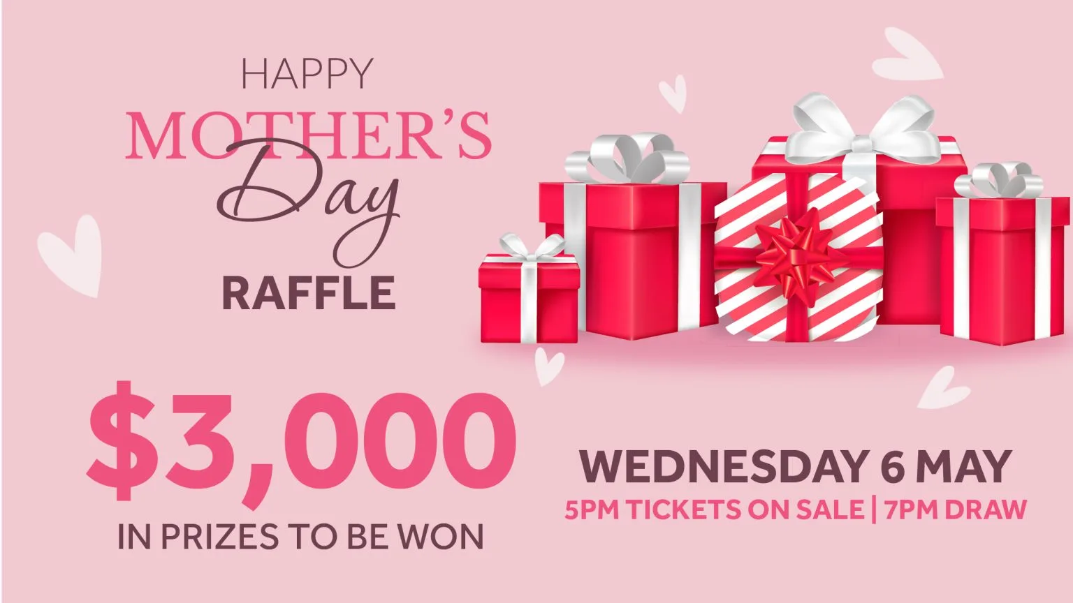 Join us on Wednesday 6 May for our Mothers Day Raffle, featuring a wide range of gifts perfect for every mother.